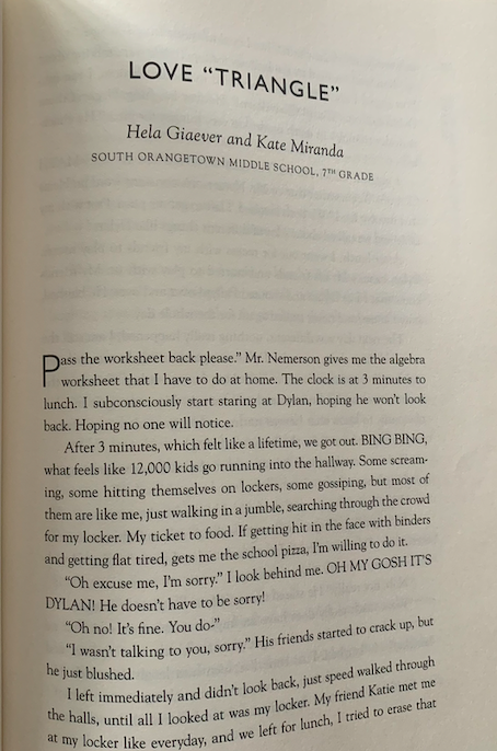 When I was in middle school I loved to write realistic fiction, using some experiences from my life as inspiration. I co-authored a piece with one of my friends, which we then entered into a publishing competition. As a seventh grader, I was the youngest author to enter the competition, which accepted literature from students grades 7 to 12. I was then interviewed by a local news outlet about my experience writing and getting published. You can read the interview here.